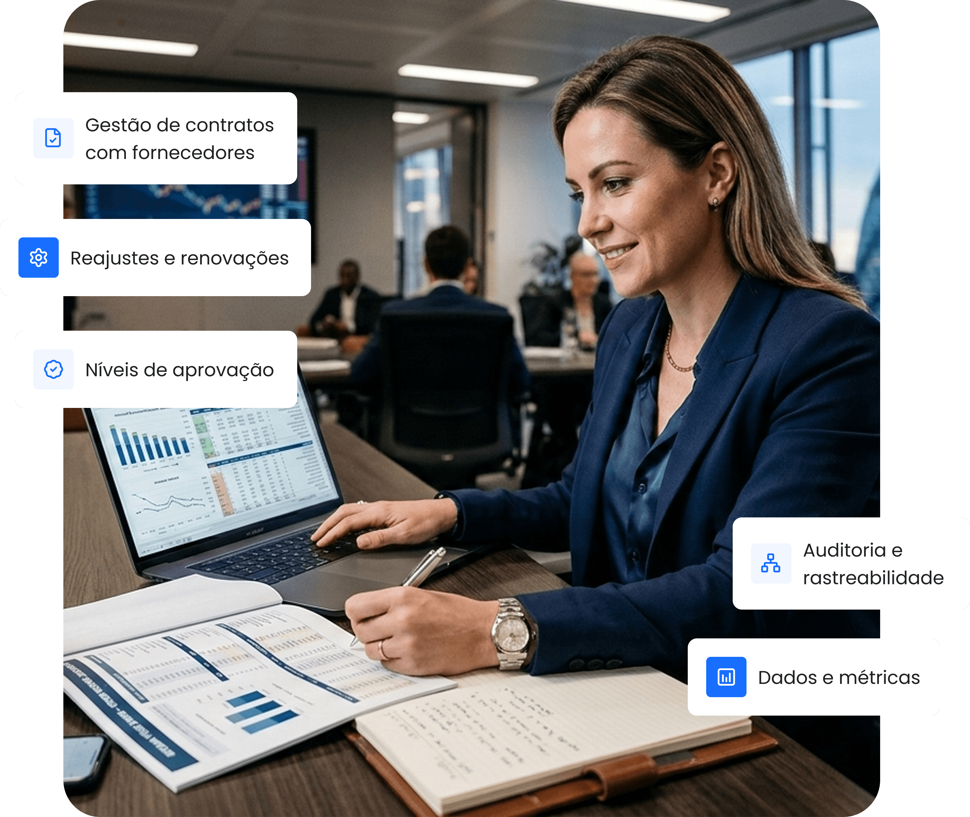 A Contraktor organiza solicitações, aprovações e obrigações contratuais para dar previsibilidade e segurança na relação com fornecedores.